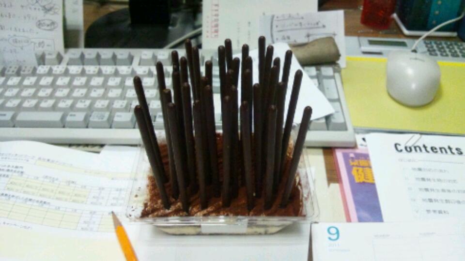 どうですか!ティラミスにろうそくではなく、年齢分のポッキーたくさんです