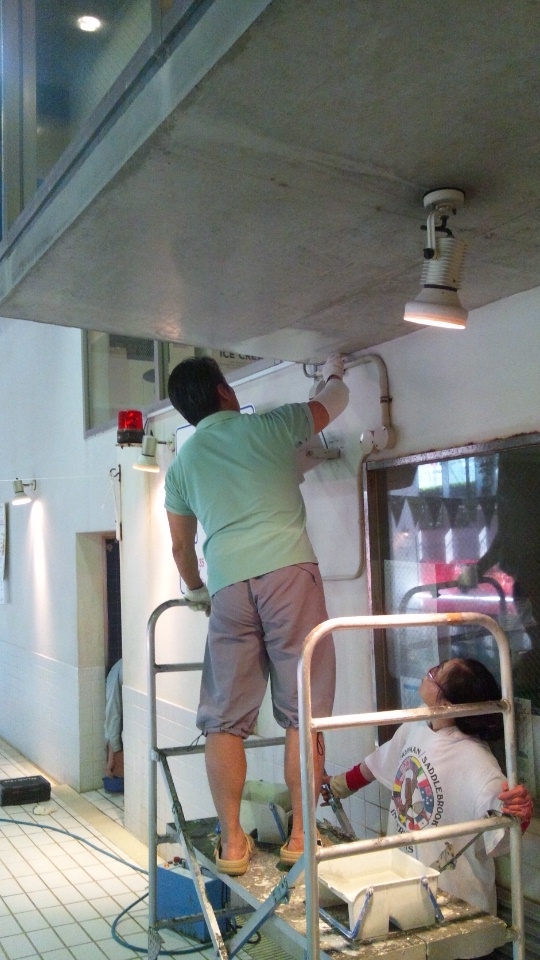 ←1Fプールサイドの天井を塗装いたしました。
