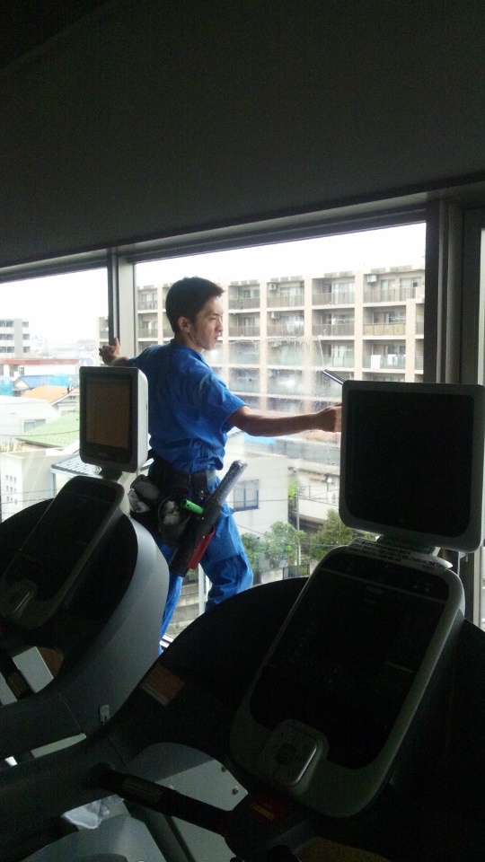 全館ですので、もちろん高いところはロープでぶら下がり、プール観覧席のプール側やスカッシュコートなど、あらゆるガラスを清掃してくださっています。