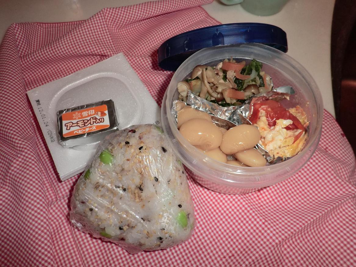 で、食事です。これにお味噌汁、かまぼこ、多分いんげんのお惣菜を足します。