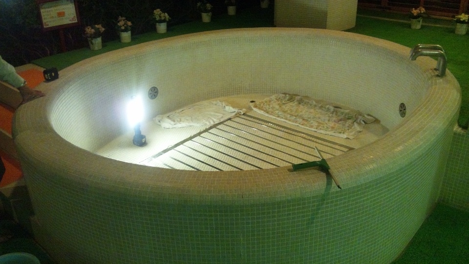 夜間になってしまいましたが、外ジャグジーのタイルの補修を行いました。