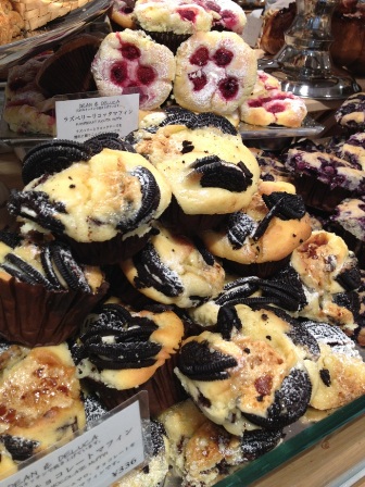 ベーカリーやアメリカンスイーツが山のように積まれていて