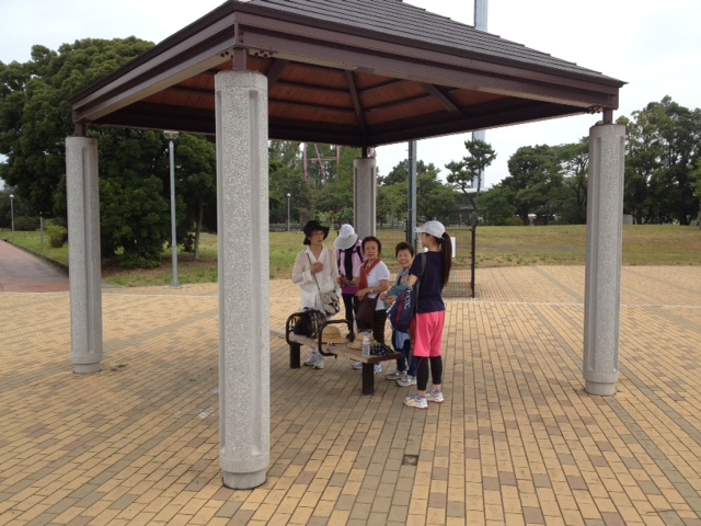 多摩湖堤防にて、休憩中の一コマ、一際目立つピンク色のハーフパンツを履いているのは小島トレーナー。