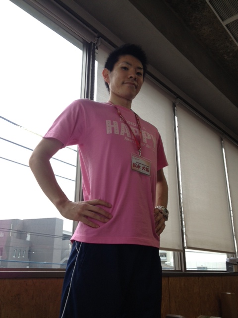 意外とピンクが似合う男、松永トレーナー。ジムトレーナー名物のドヤ顔です。