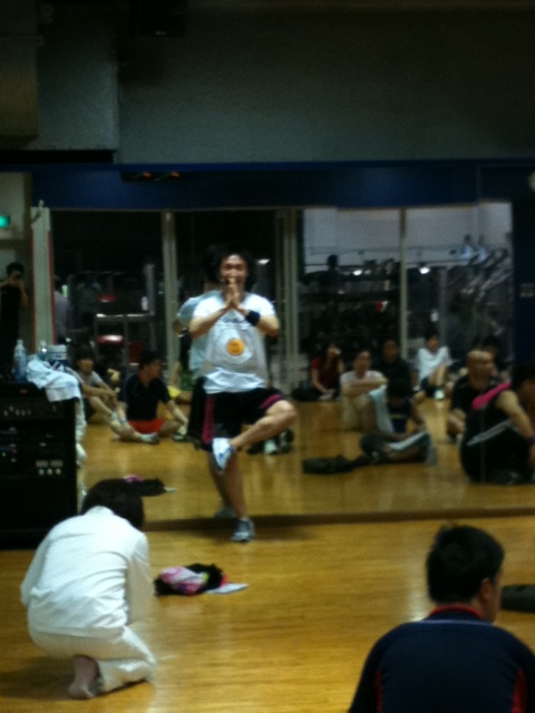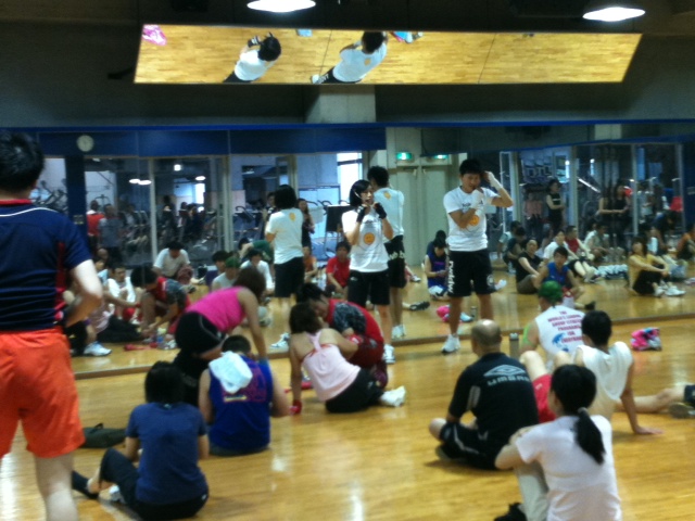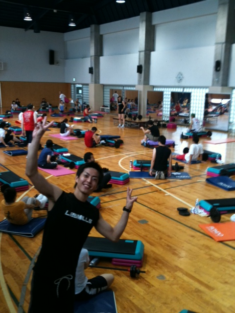 「PUMP開始直前、テンションが高く珍しく両手ピースをする飯島インストラクター」
