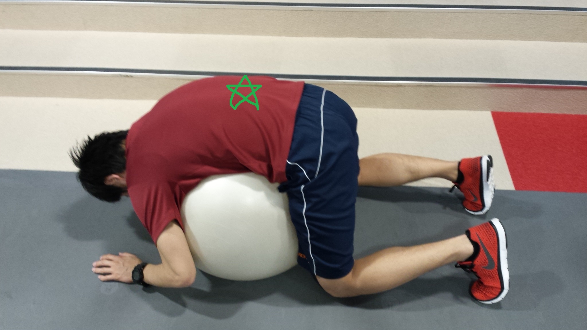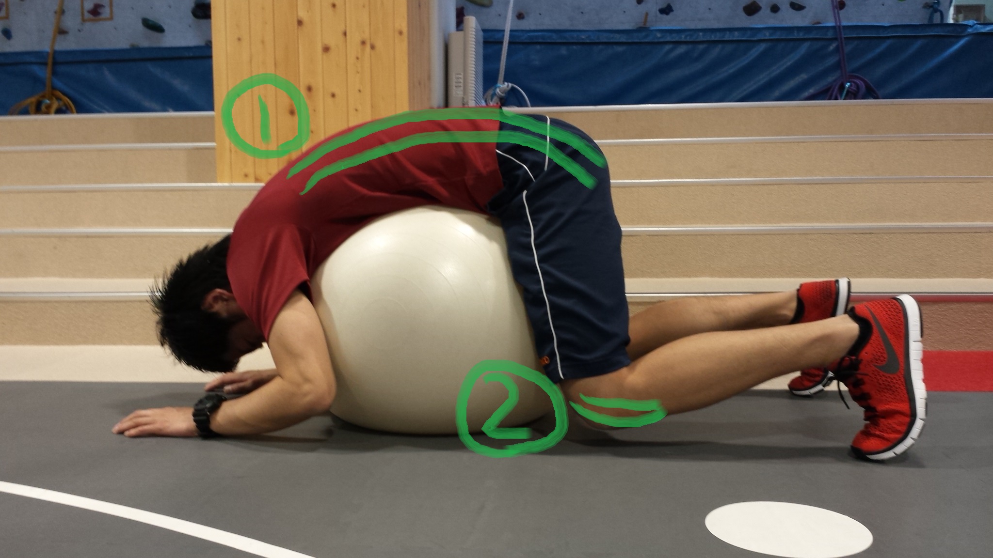 ①ボールに沿って背中を丸めます(腰部が頂点にくるように…)