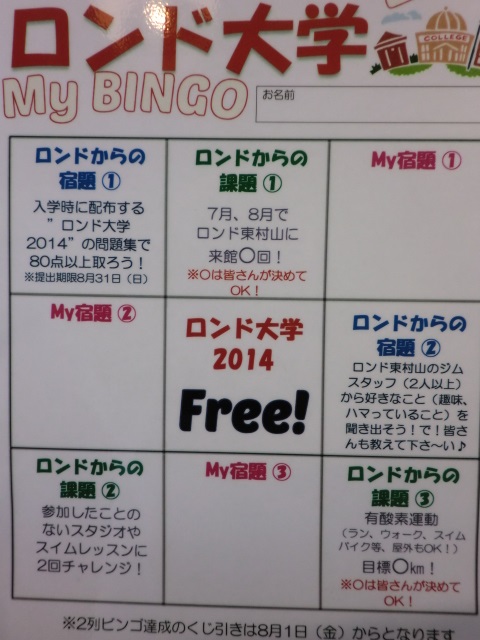 こちらがビンゴカードです。”my宿題”となってる空白の枠にこの夏の目標を決めて埋めます。どの宿題をどこに入れるかによってもビンゴ達成に関わってきますよ~