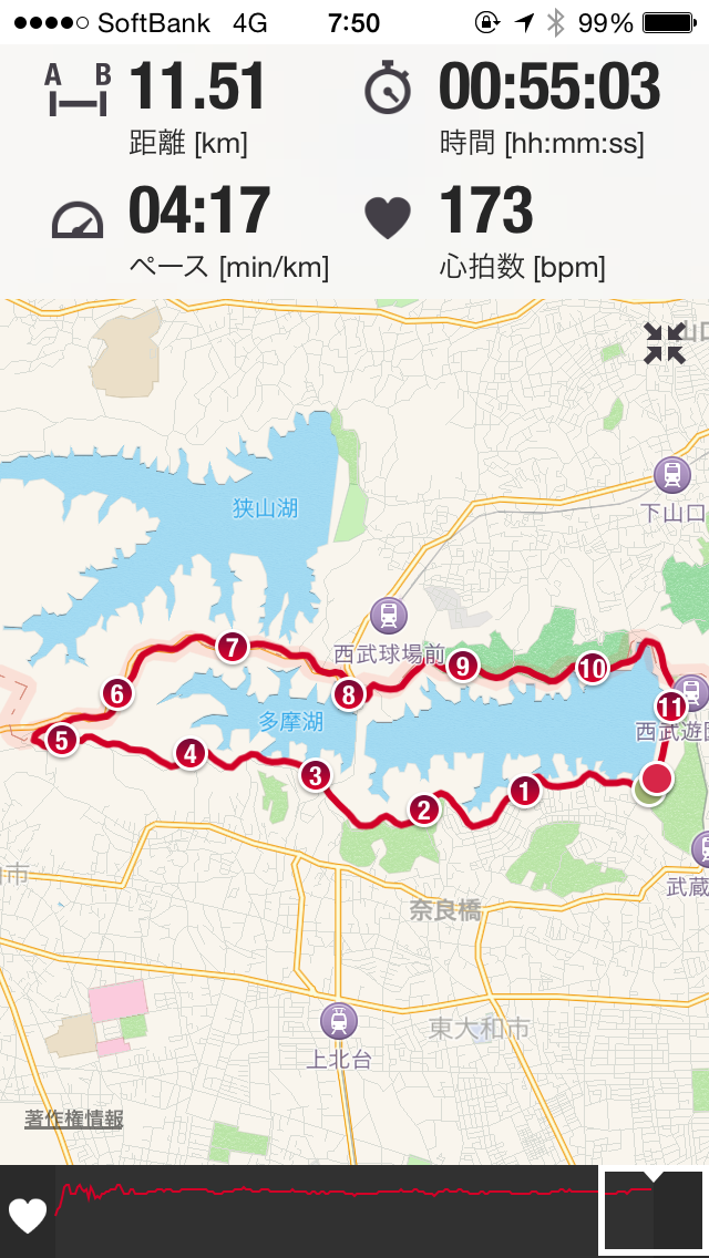 こんな風に走った場所やスピード、心拍数などのデータが見られるんです。
