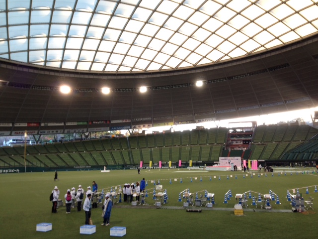 普段、入ることのできないグランドの芝生で寝そべりながらウォーミングアップ。
